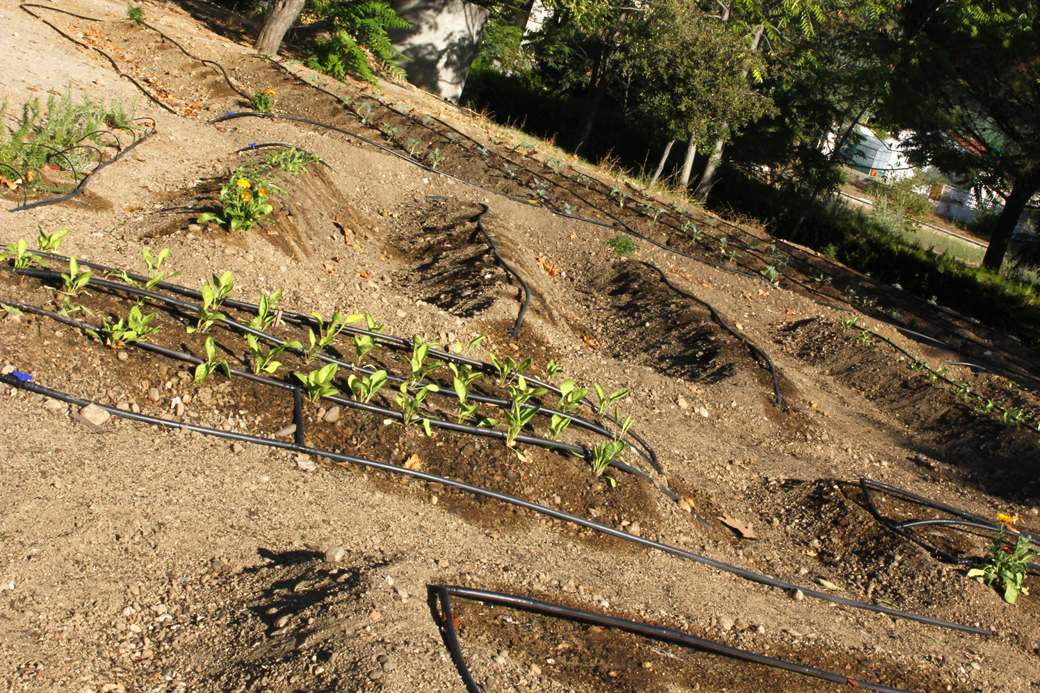 Pero si en verano el huerto se va a seguir usando, aunque sea con un mantenimiento de baja intensidad y habrá personas que cosechen en él durante las vacaciones, puede ser interesante tener un riego por goteo. La misma situación se da si en el huerto no se va a poder dedicar tiempo (ni los grupos de alumnos ni los adultos responsables) al riego regular.